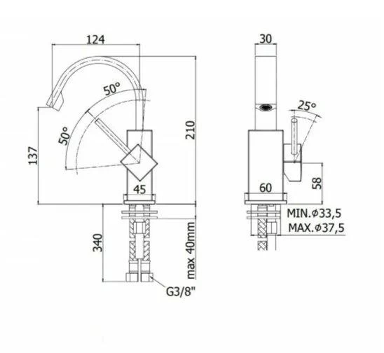- hauteur de la robinetterie : 210 mm